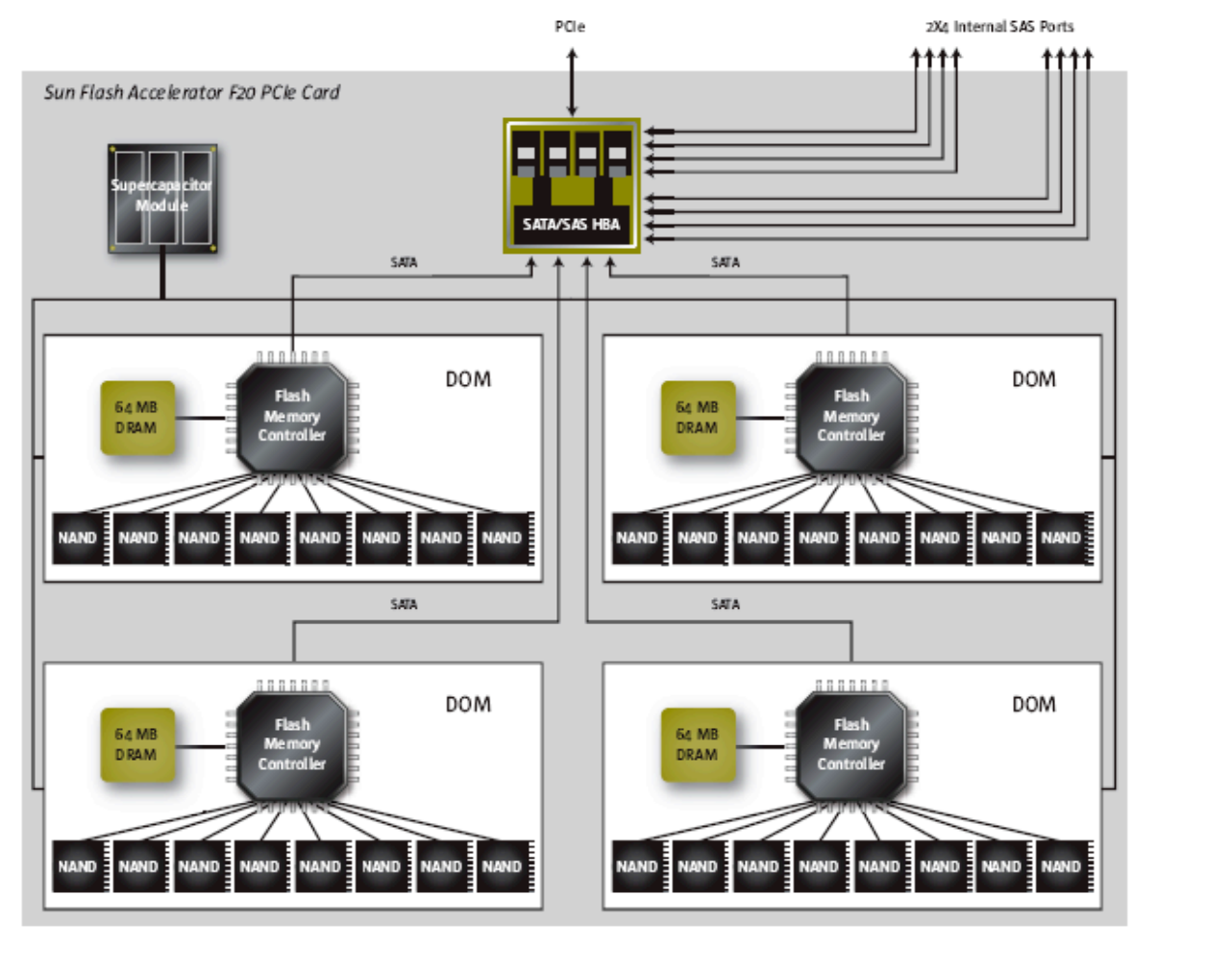 在 Sun Flash Accelerator F20 PCIe 卡中,DOM(Disk on Module) 是一个非常关键的创新设计。它把闪存存储和控制芯片紧密集成在一个小巧的模块中,实现了高性能和高可靠性的平衡。