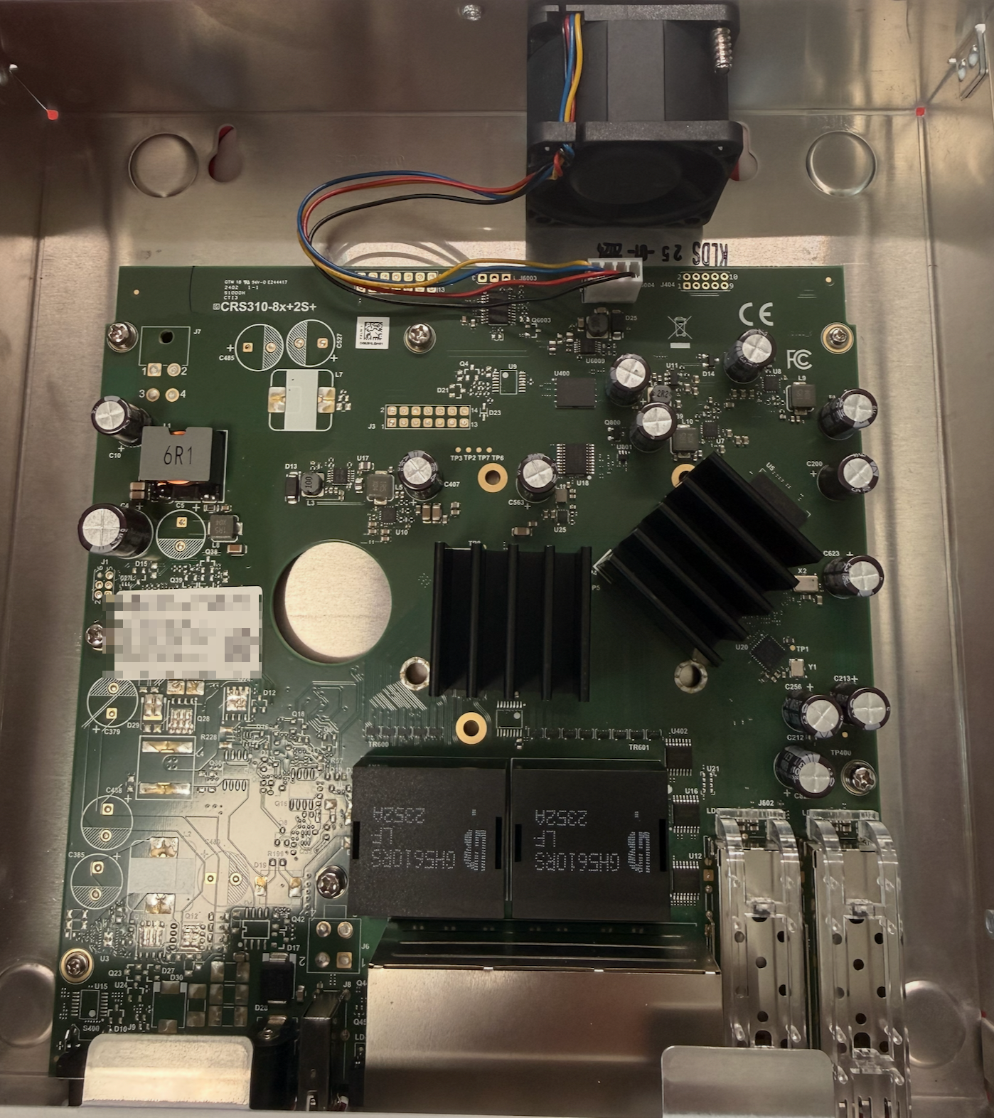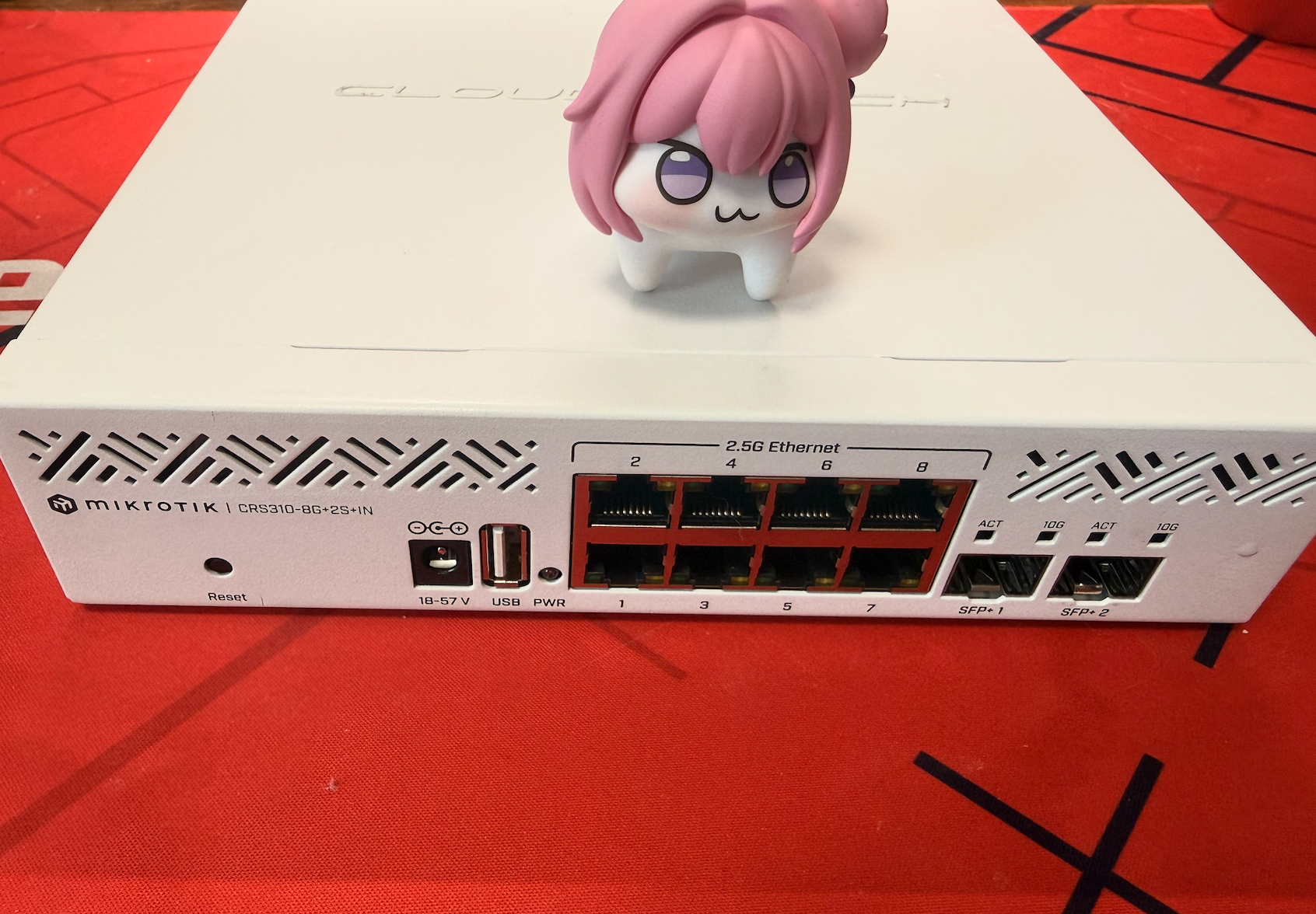 机缘巧合之下(哇 咸鱼有特价),我买下了这款CRS310-8G+2S+IN的交换机。(下图被挡住的事机器的信息,Mikrotik的新设备已经启用了随机密码策略。密码将会被贴在盒子/说明书/机箱/主板这四个地方。如果都丢了你只能去找经销商查询)