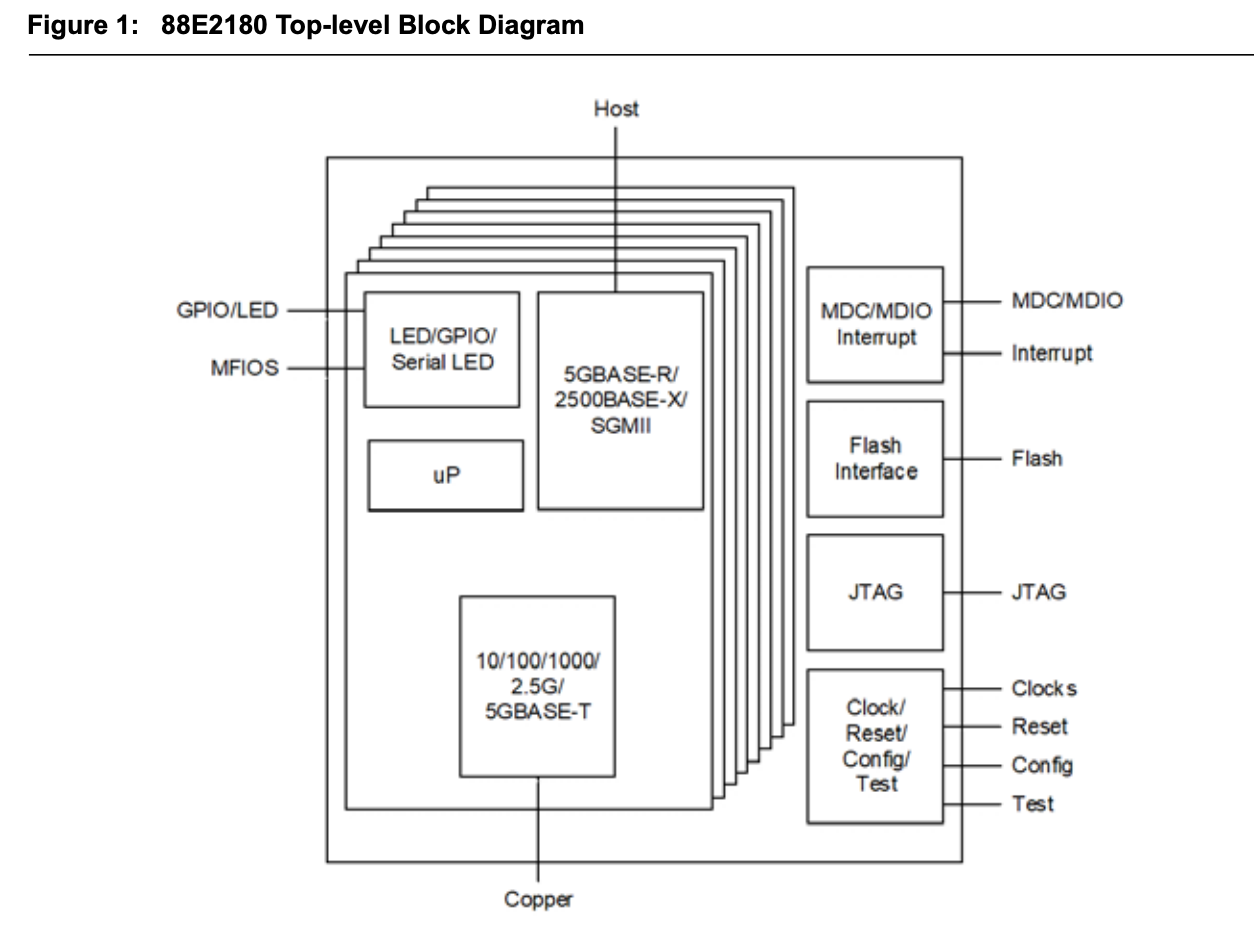 内部结构算得上比较简陋了,大量未贴片的焊盘(估计是为了日后推出其他版本用的)一共有两个散热片,网变后面的散热片下面压的是Marvell 88E2180 8口5速的PHY。